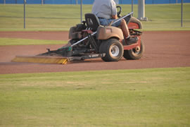When grooming the infield, your top priority should be maintaining the proper surface grade. This will prevent low spots from developing and promote a smooth, level playing surface. Grooming equipment should be operated at a slow, consistent speed, especially when turning. Changing dragging patterns frequently, as well as starting and stopping points, will help cut high spots and fill low areas. Try to keep mechanized equipment six to eight inches away from edges. Use hand tools along edges and in tight areas to ensure a smooth transition from dirt to grass.